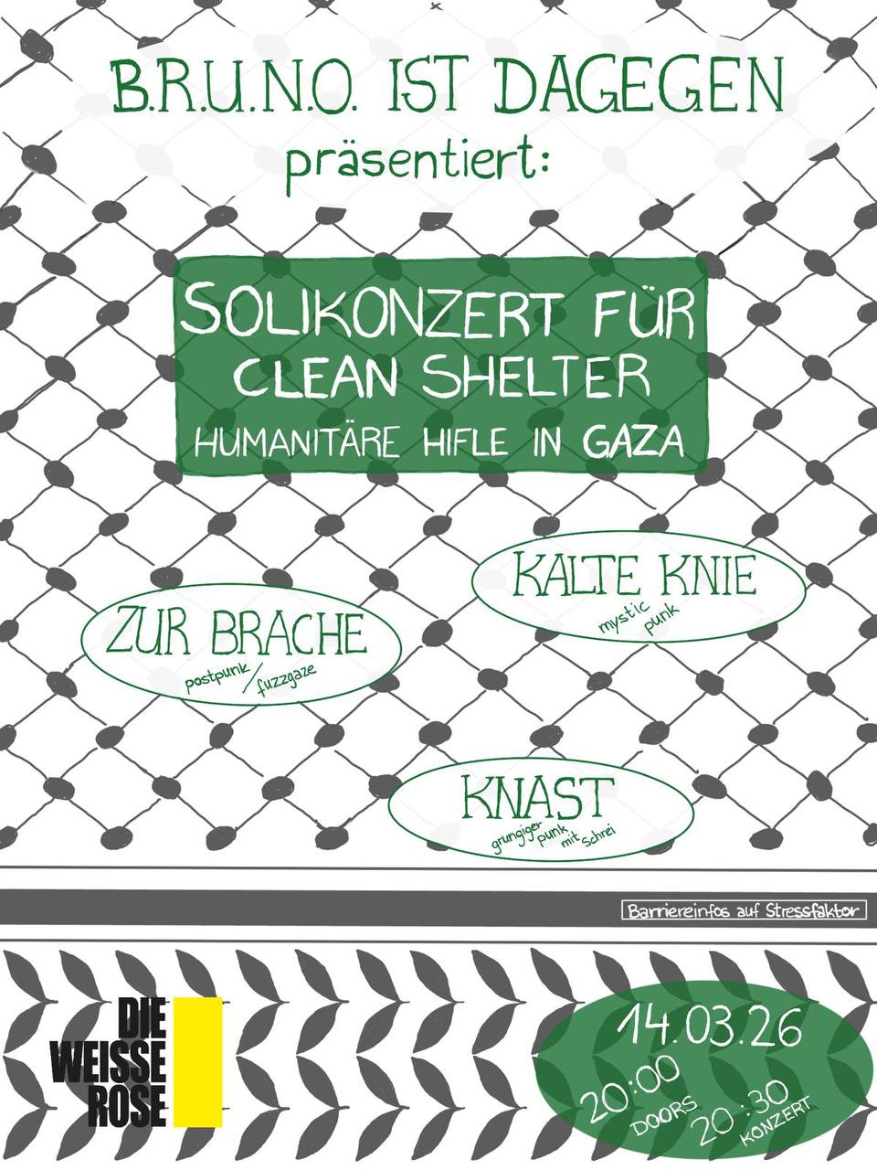 More information at: B.R.U.N.O. ist dagegen präsentiert: Soli-Konzert für clean shelter – Humanitäre Hilfe in Gaza – Queere Jugend Berlin