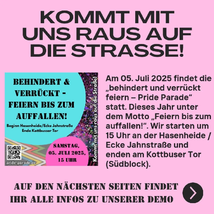 Disabled & Crazy – Party until you get noticed! On Saturday, 05/07/2025 from 15:00 at Hasenheide / Janhstrasse (This event is not organized by The Left Berlin) More information at Instagram
