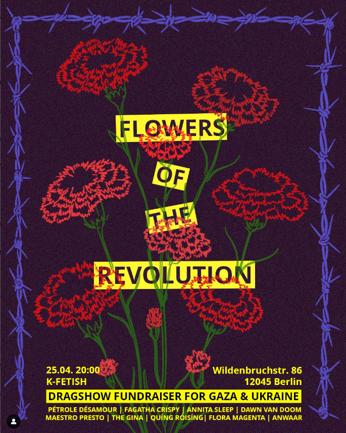 Dragshow fundraiser for Gaza and Ukraine. More information at https://www.instagram.com/p/DIqs7SiCh1f/?locale=it&hl=en