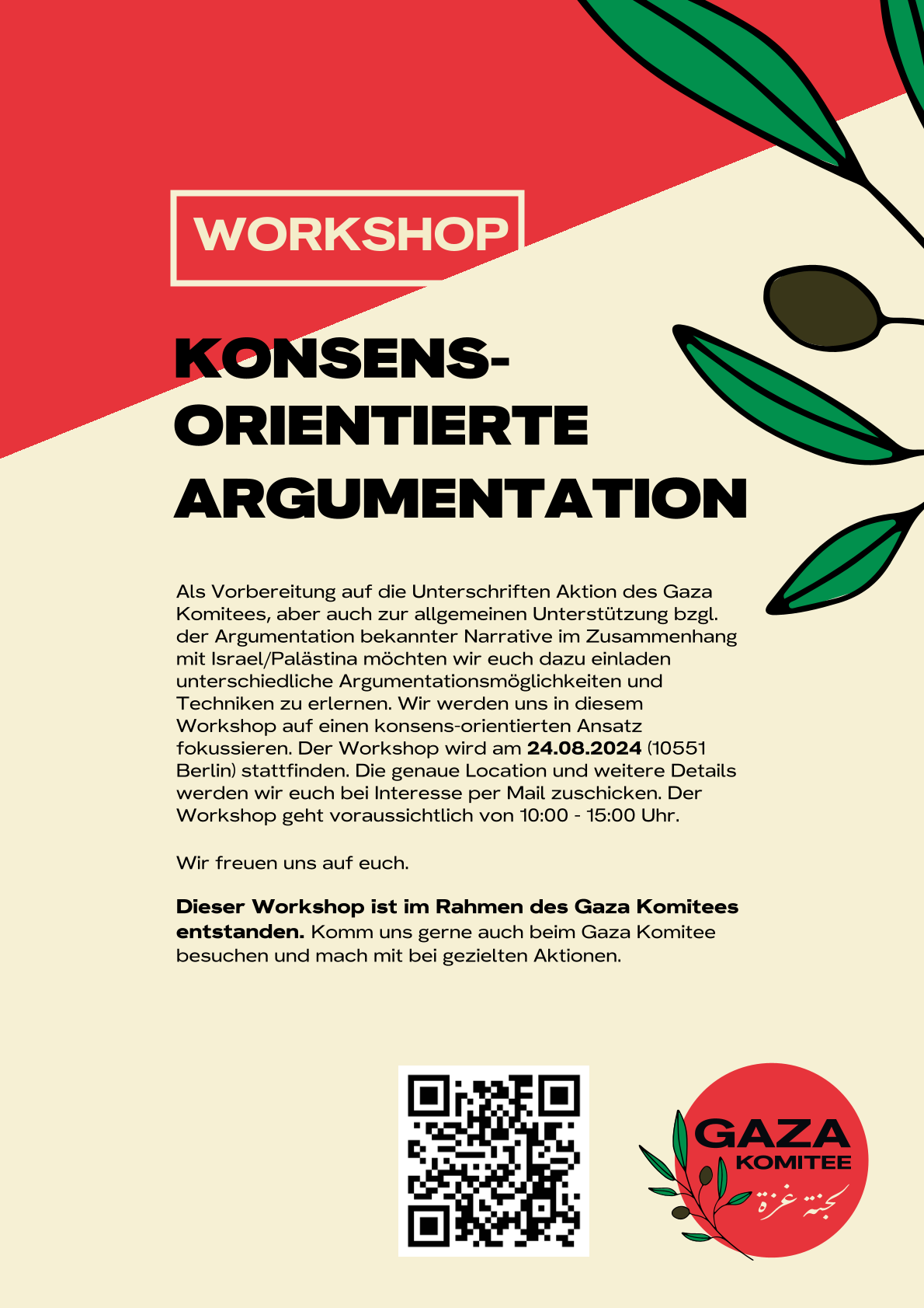 Als Vorbereitung auf die Unterschriften Aktion des Gaza Komitees, aber auch zur allgemeinen Unterstützung bzgl. der Argumentation bekannter Narrative im Zusammenhang mit Israel/Palästina möchten wir euch dazu einladen unterschiedliche Argumentationsmöglichkeiten und Techniken zu erlernen. Wir werden uns in diesem Workshop auf einen konsens-orientierten Ansatz fokussieren. Der Workshop wird am 24.08.2024 (10551 Berlin) stattfinden. Die genaue Location und weitere Details werden wir euch bei Interesse per Mail zuschicken. Der Workshop geht voraussichtlich von 10:00 - 15:00 Uhr.