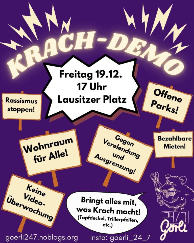 More information at: https://goerli247.noblogs.org/post/2025/12/10/krach-demonstration-freitag-19-12-17-uhr-lausitzer-platz/