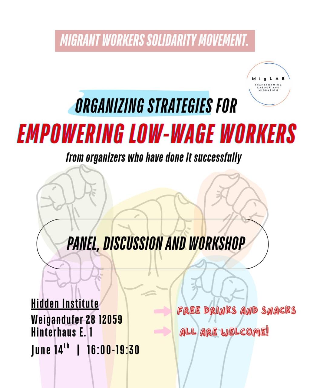 More information at Event Registration / Anmeldung zur Veranstaltung Organizing Strategies for Empowering Berlin Low-wage workers, Saturday, 14.06.2025, 16 - 19:00 / 4 - 7:30 pm