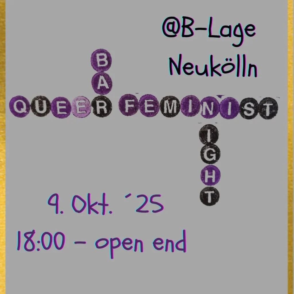 Queer Feminist Bar Night On Thursday, 09/10/2025 from 18:00 at B-Lage (This event is not organized by The Left Berlin) More information at: Instagram