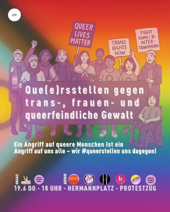 Que(e)rs stand up against transphobic, misogynistic & queerphobic violence On Thursday, 19/06/2025 from 18:00 at Hermannplatz (This event is not organized by The Left Berlin) More information at Instagram