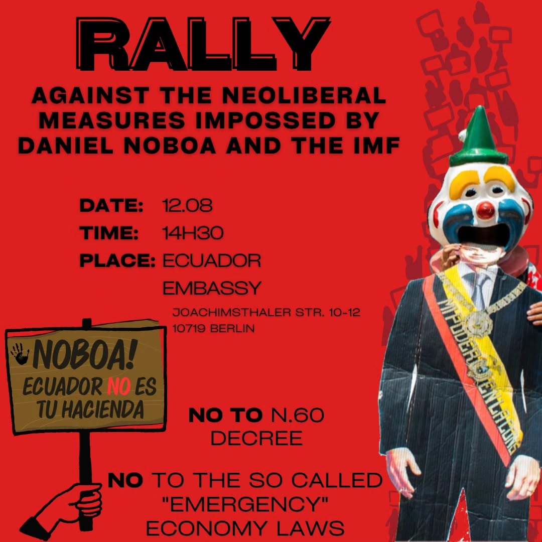 Rally On Tuesday, 12/08/2025 from 14:30 at Ecuadorian Embassy (This event is not organized by The Left Berlin) More information at Instagram