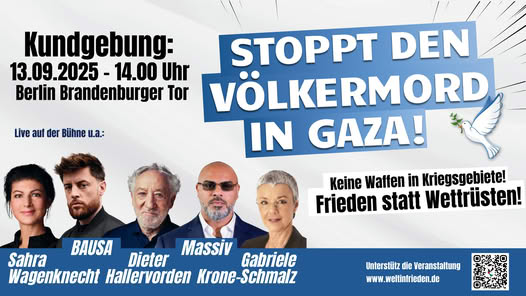 Stop the Genocide in Gaza On Saturday, 13/09/2025 from 14:00 at Brandenburger Tor (This event is not organized by The Left Berlin) More information at https://weltinfrieden.de/