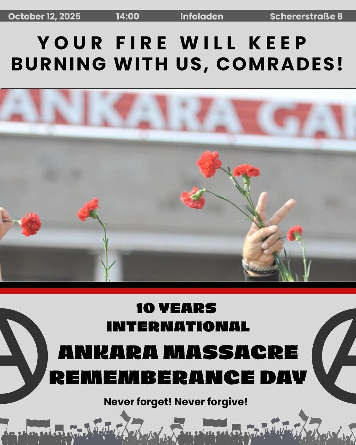 Your fire will keep burning with us, comrades! On Sunday, 12/10/2025 from 14:00 at Infoladen Scherer 8 (This event is not organized by The Left Berlin) More information at: Instagram